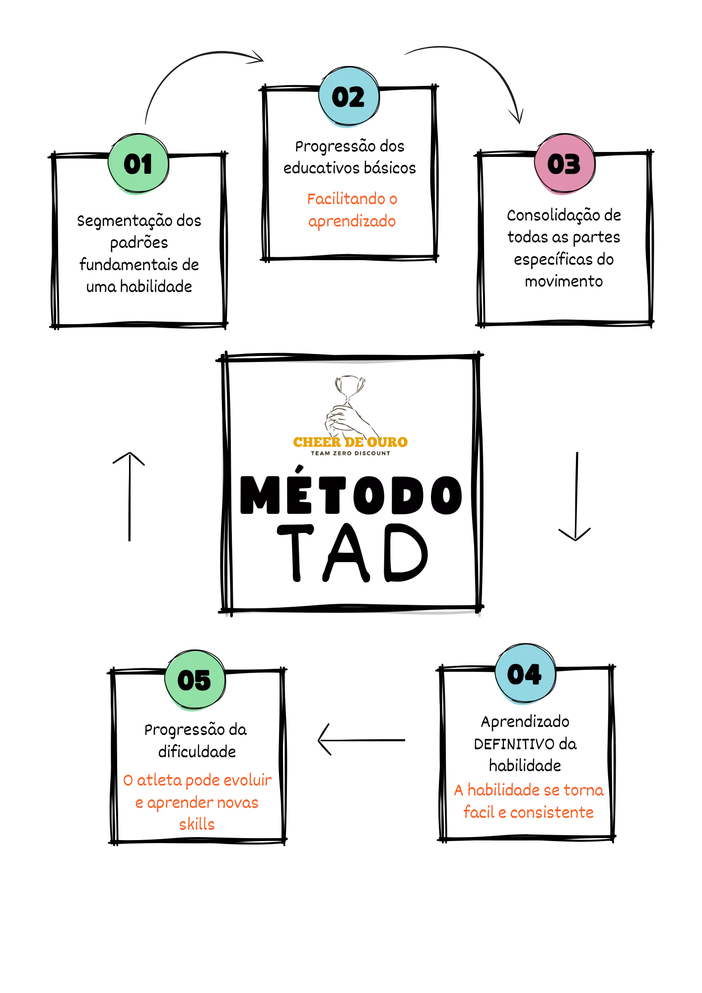 O método TAD, se baseia nas fases da aprendizagem motora para garantir um aprendizado preciso e seguro, a partir da segmentação dos movimentos básicos e avançados de cada nível em educativos que seguem uma progressão segura e planejada, para total eficiência do processo e um aprendizado definitivo das habilidades de cheerleading. O método TAD é dividido em cinco etapas: